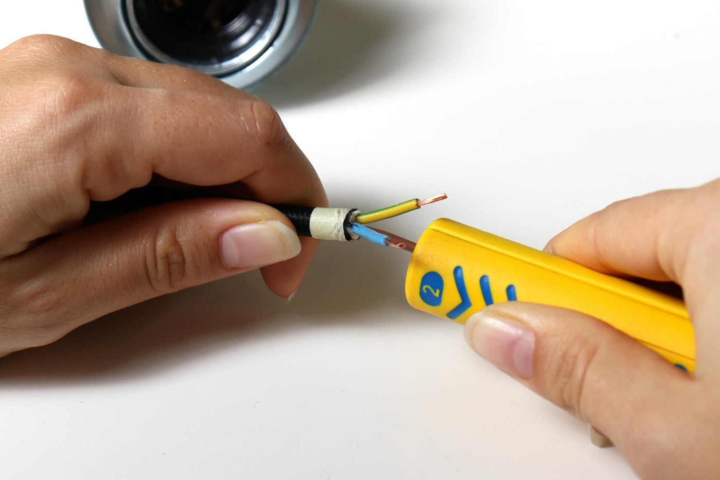 Abschließend müssen die nun mitsamt dem Lampenkabel gekürzten Litzen auch wieder anschlussbereit gemacht werden. Das bedeutet, dass auch diese gekürzt werden, wofür praktischerweise erneut der Rundkabel-Entmantler mit der dafür vorgesehenen Einstellung genutzt werden kann.