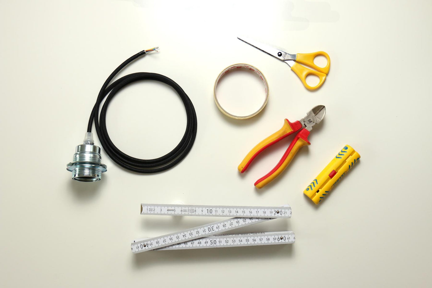 Auf diesem Foto finden Sie alles, was die Elektrofachkraft zum Kürzen des Textilkabels benötigen wird.