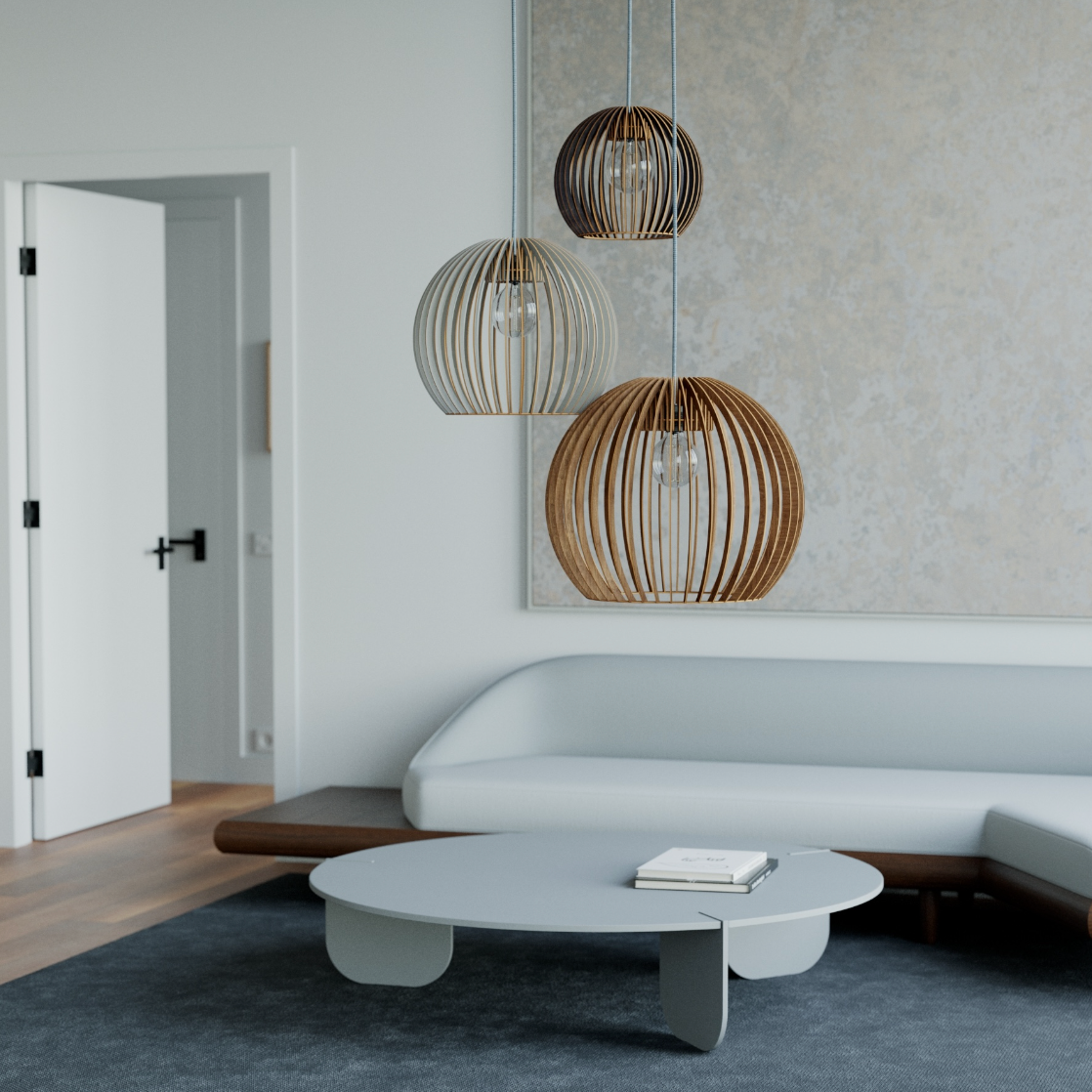 In großen Räumen mit hohen Decken eignen sich größere Pendelleuchten oder solche mit mehreren Leuchtkörpern, wie die Holz-Pendelleuchte BOLA. Sie bietet eine beeindruckende Präsenz und ausreichend Helligkeit.