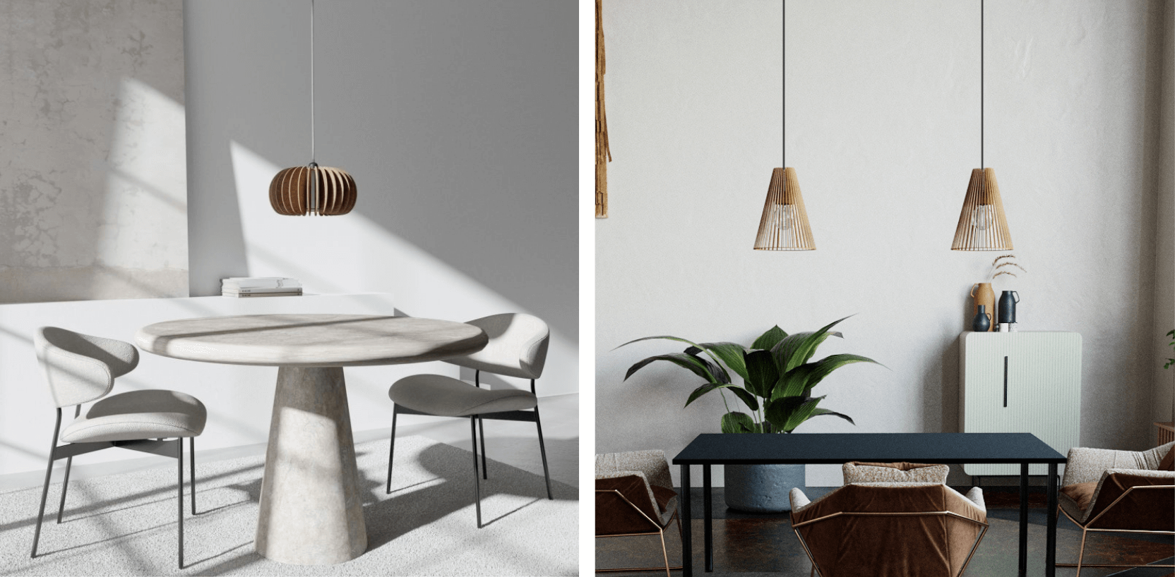 - Esstisch-Leuchten von farbflut Design: Unsere Hängelampen wie die Modelle ZEUS und CAMPANA verbinden modernes Design mit nachhaltigen Materialien.