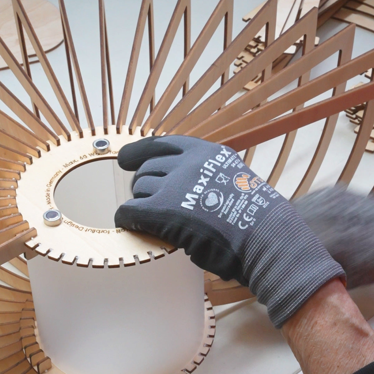 In unserer familiengeführten Manufaktur in Bayern entsteht jede RAYOS Leuchte in echter Handarbeit. Das verwendete Birkenholz stammt aus zertifizierter Forstwirtschaft in Finnland und wird mit natürlichem Wachs veredelt – für eine langlebige, pflegeleichte Oberfläche, die nicht nur gut aussieht, sondern sich auch gut anfühlt. Das verwendete Wachs ist kindersicher und lebensmittelecht – bewusst, nachhaltig, verantwortungsvoll.