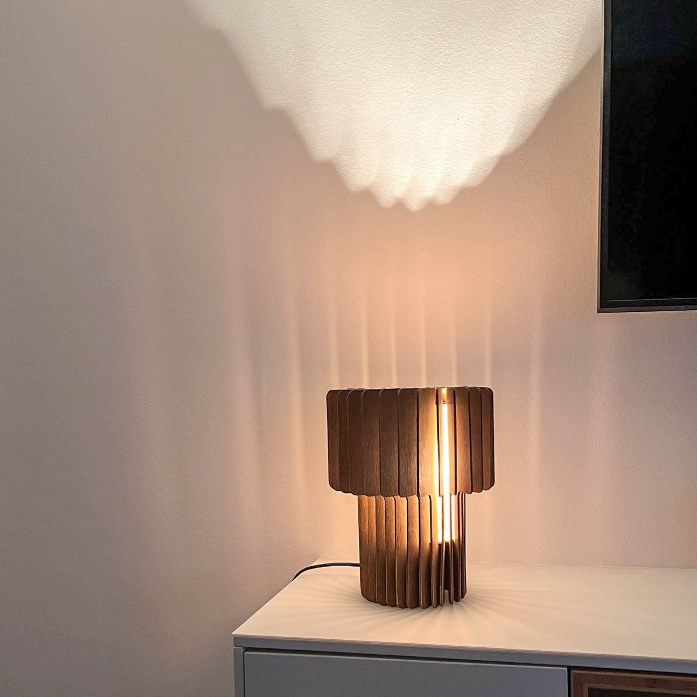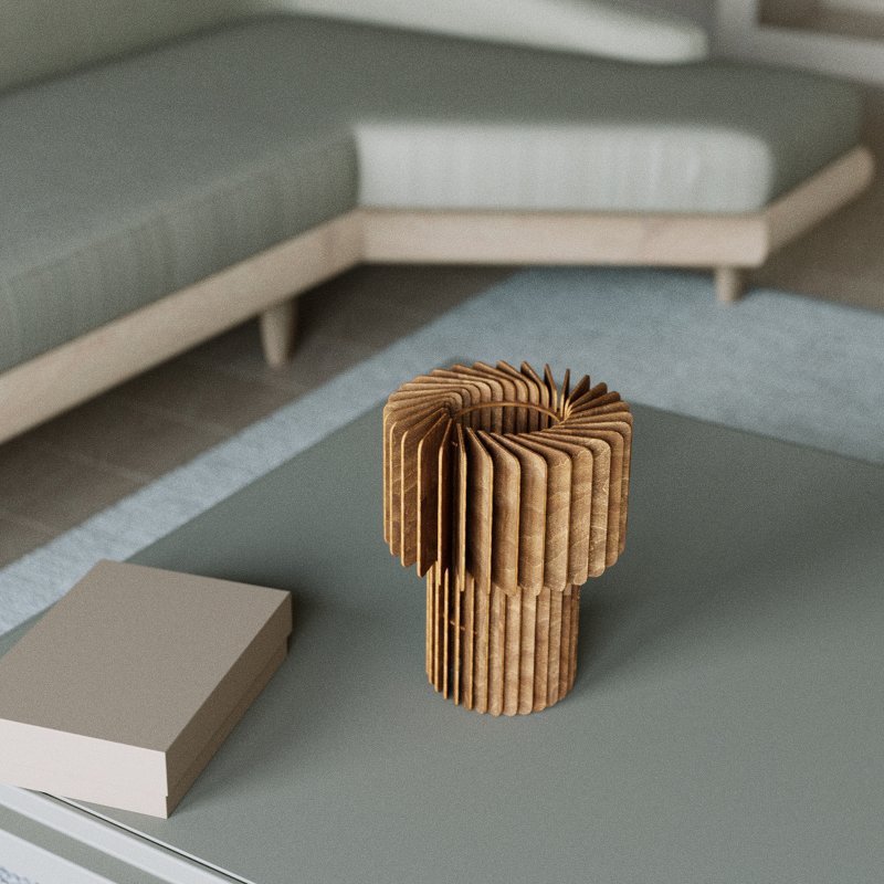 FARO bringt eine besondere Stimmung auf jeden Tisch. Ihr warmes, indirektes Licht fällt durch feine Holzlamellen und erzeugt ein lebendiges Spiel aus Licht und Schatten – ideal für gemütliche Abende, sanfte Akzente im Raum oder ein stimmungsvolles Nachtlicht. Die Leuchte wirkt dabei nie aufdringlich, sondern verleiht der Umgebung Ruhe, Natürlichkeit und Struktur.